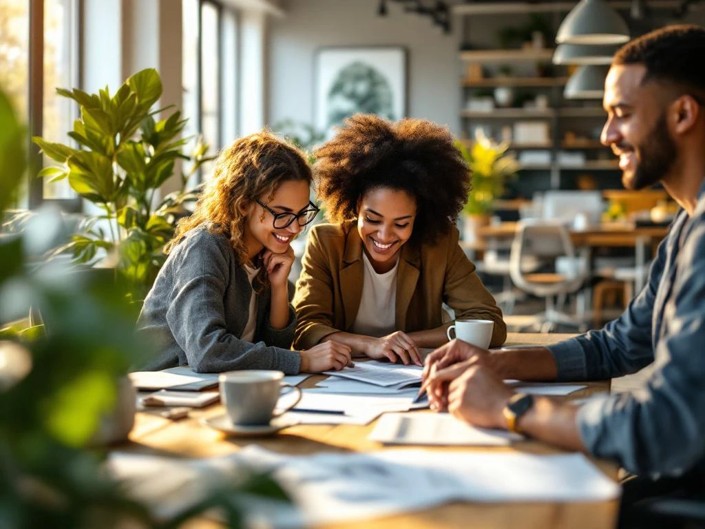 Diverse handen werken samen aan documenten op houten bureau in licht kantoor met planten en moderne werkruimte