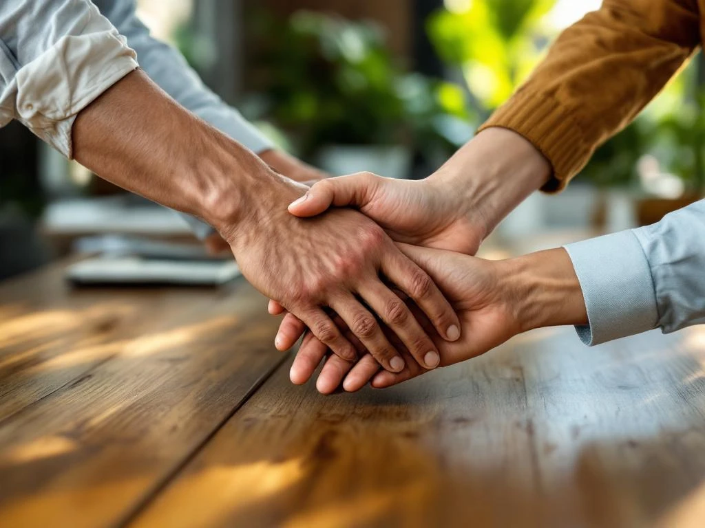 Diverse handen komen samen boven houten vergadertafel in duurzaam kantoor met planten en natuurlijk licht