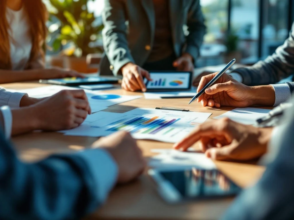Diverse handen werken samen rond houten vergadertafel met wellness-grafieken op tablets in modern kantoor